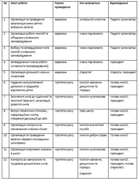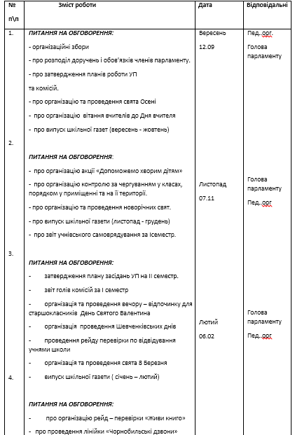 ПЛАН ЗАСІДАНЬ УЧНІВСЬКОГО ПАРЛАМЕНТУ
